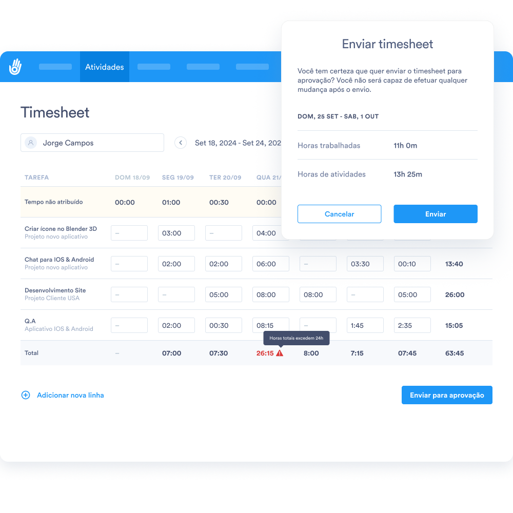 Após registrado o tempo trabalhado, o colaborador envia para aprovação todo o tempo de trabalho em cada atividade ao gestor. Apesar de simples, a aprovação garante a confiabilidade dos dados, bem como a garantia de que o tempo e custo despendido está de acordo com o esperado, evitando surpresas ao longo do projeto.