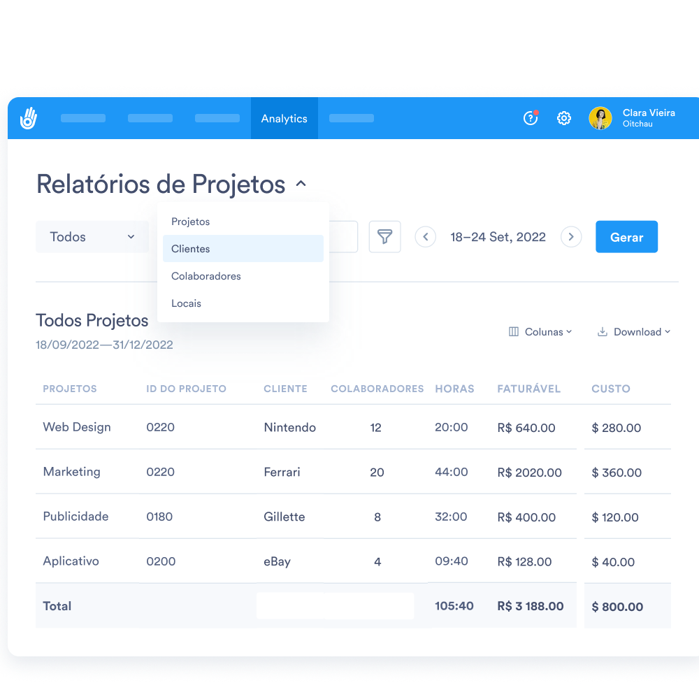 Você pode gerar diferentes tipos e visões de relatórios para facilitar suas análises. Organize os dados por projetos, clientes, colaboradores, localizações ou tarefas. Em cada relatório, filtre por data, tarefas aprovadas, entre outros.