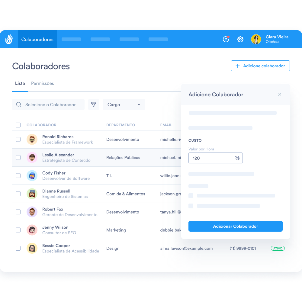 Convide sua equipe e configure o custo por hora de cada colaborador, o tipo de serviço e a localização do projeto.