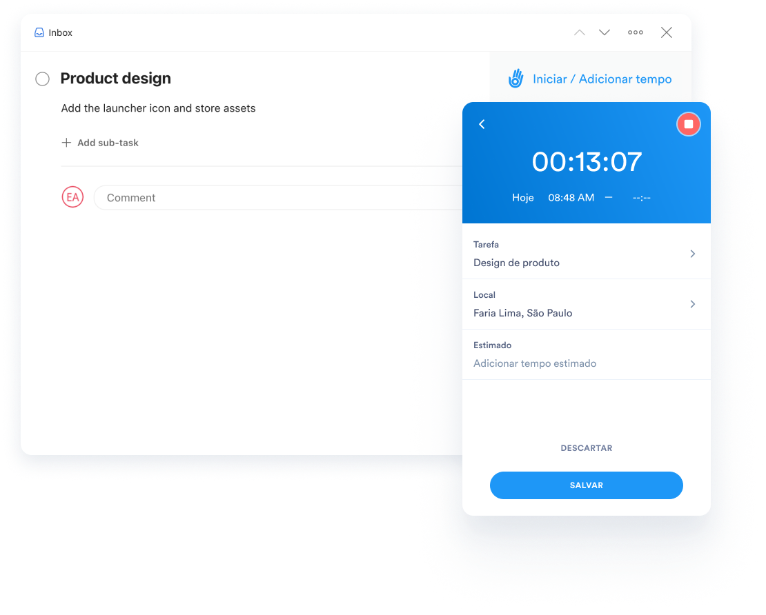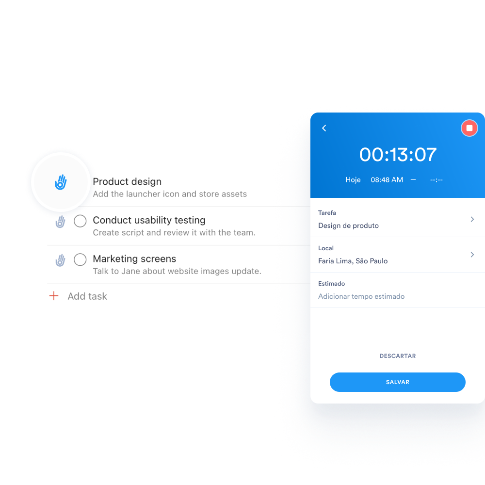 A integração permite que seu time registre o tempo trabalhado em cada tarefa dentro do próprio Todoist. Não é necessário trocar de tela ou aprender uma nova ferramenta.